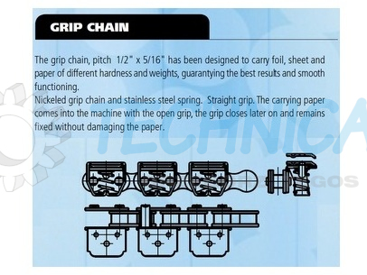 Łańcuchy typu gripper wykorzystywane są w przemyśle opakowań. Łańcuchy gripper służą do pobierania i podawania folii na liniach produkcyjnych wykorzystujących maszyny do formowania termicznego. Wykonywane są ze stali niklowanej, ze stali nierdzewnej, bądź też poddawane są one specjalnym procesom zabezpieczającym przed korozją, jako że mają one kontakt z żywnością. W naszej ofercie znajdują się trzy rodzaje tego typu łańcuchòw do podawania folii - łańcuch do ciągnięcia folii (według rysunków).