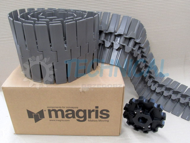 Łańcuchy transportujące płytkowe plastikowe Magris dla możliwości zbudowania przenośnika zawiera elementy napędowe i bierne oraz ślizgowe prowadzące czy podporowe łańcuch z ładunkiem dla zbudowania odpowiedniej ścieżki biegu linii transportującej. W skład wyposażenia łańcuchów płytkowych Margis można zakupić w komplecie czy osobno koła napędowe czy koła bierne oraz profile prowadzące wytłaczane na ekstruderach, prowadnice ślizgowe, prowadnice łukowe na zakręty.