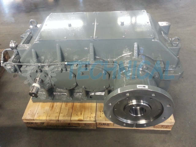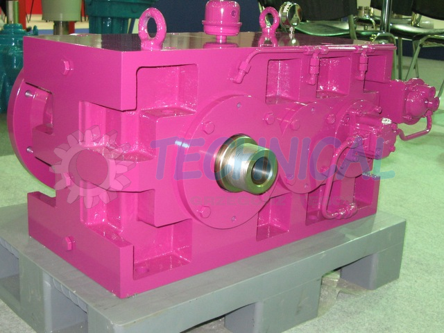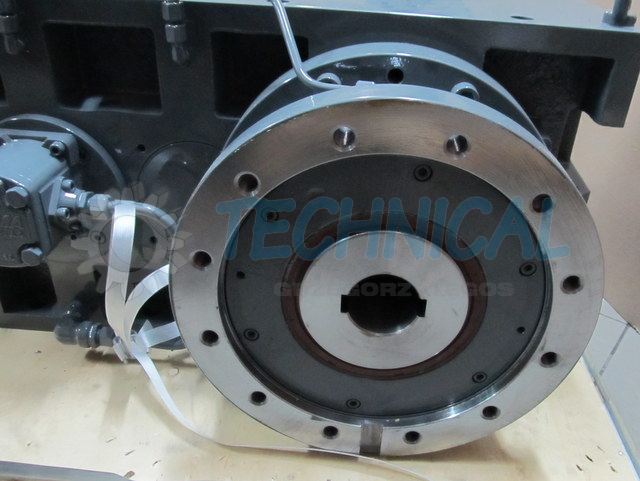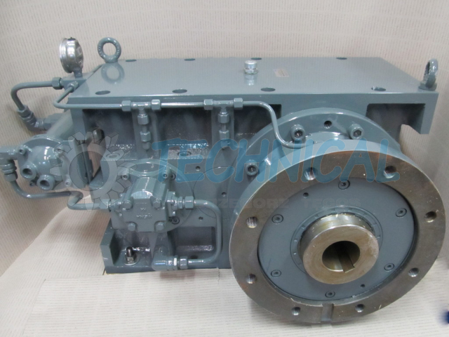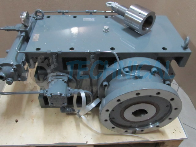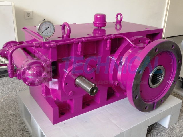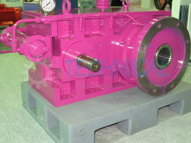 Oferujemy kilka wielkości - cały typoszereg reduktorów przemysłowych z kołnierzem do wytłaczarek. Jest to nasza oferta reduktorów przemysłowych z łożyskiem oporowym. Kołnierz jest dostępny w różnych rozmiarach a nawet możliwe jest specjalne wykonanie. Duże łożyska oporowe w kołnierzu reduktora przemysłowego właściwie przejmują siły procesowe od wytłaczarek na bardzo sztywną konstrukcję korpusu reduktorów przemysłowych. Reduktory przemysłowe z łożyskiem oporowym, które oferujemy posiadają wysoki stopień elastyczności w zaprojektowaniu wykonania reduktorów walcowych z łożyskiem oporowym, różnorodnym opcjom dla wałów napędowych i wyjściowych, zamocowań, uszczelnień, chłodzenia oleju i wykonanie ściągacza - wypychacza wału ekstrudera z ślimakiem.