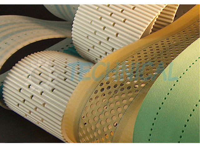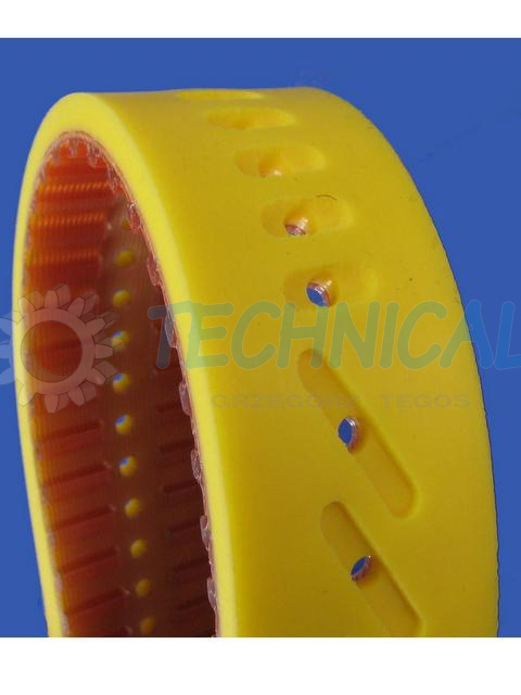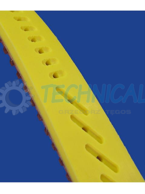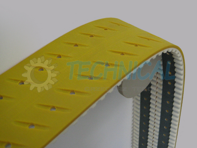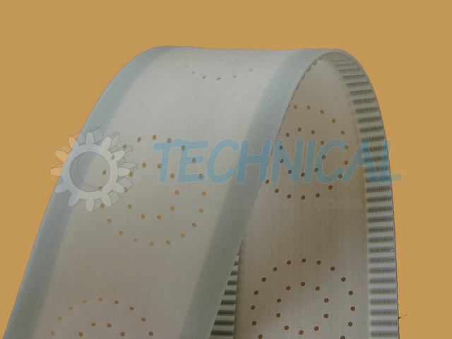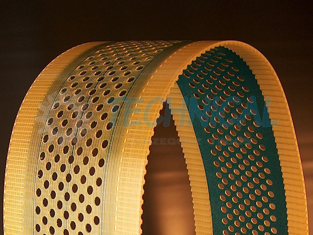 Pas zębaty z otworami do pracy w podciśnieniu vaccum. W pasie zębatym wykonuje się specjalne otwory do możliwości uzyskania podciśnienia - zasysania powietrza przez otwory w pasie. Dzięki zastosowaniu pasów zębatych z otworami można przytrzmywać produkt transportowany poprzez podciśnienie.