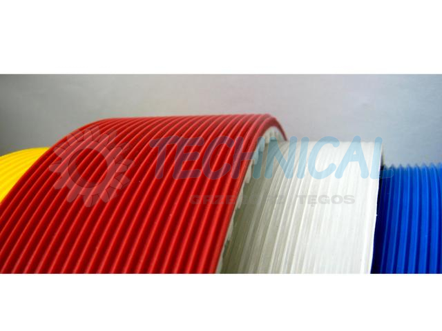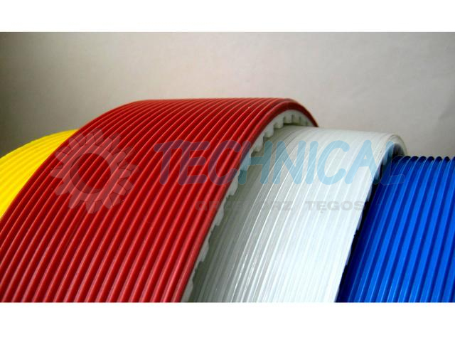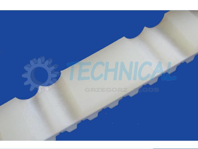 Pas zębaty z białą gumą do transportu parówek - kiełbasek. Guma jest z atestem spożywczym i jest przymocowana do paska zębatego. Pasek zębaty do kiełbasek posiada specjalnie wyfrezowana gumę do prowadzenia kiełbaski - parówki z nadziewarki. Pasek do kiełbasek musi mieć odpowiednie wyfrezowania do średnicy parówek czy transportowanych kiełbas.