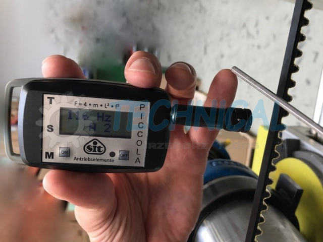 Można również uderzyć w pas palcem, podobnie jak w strunę gitarową. Na drugim foto urządzenie pomiarowe wskazuje z jaką częstotliwością drga pas.