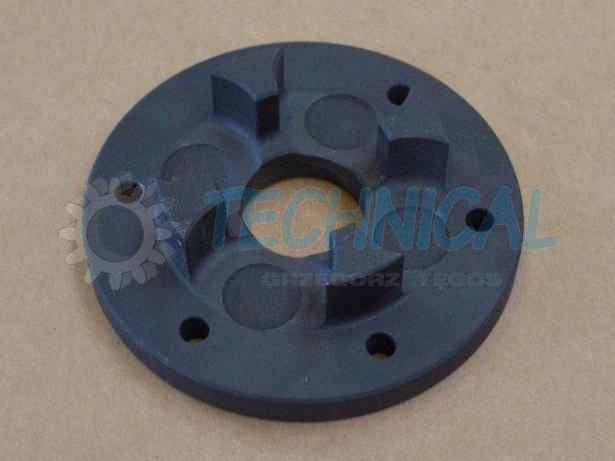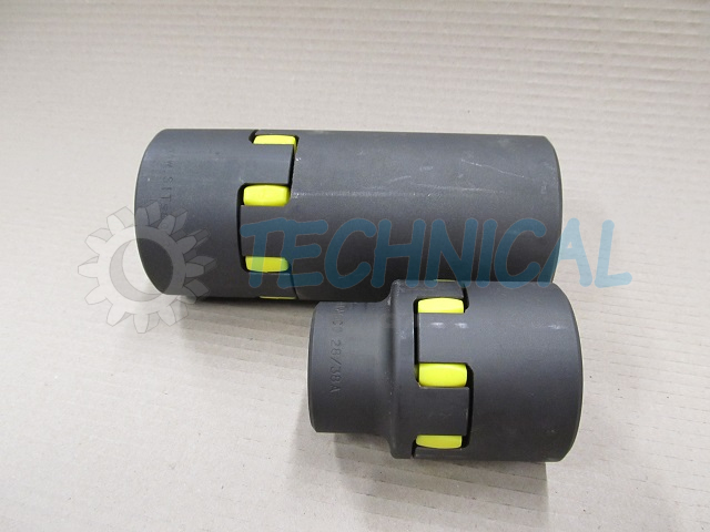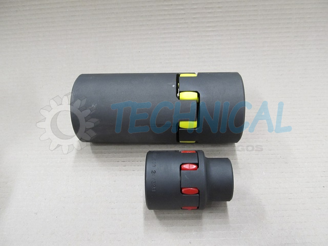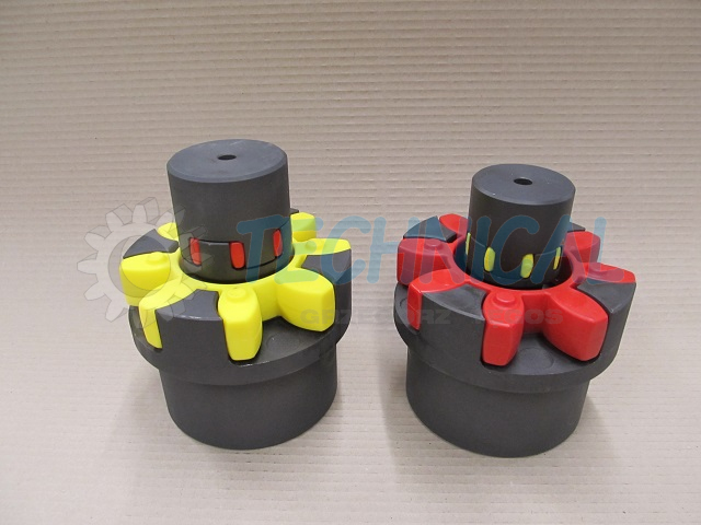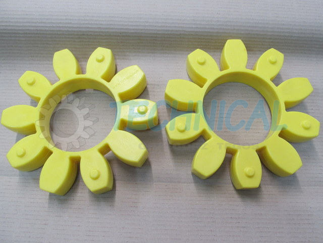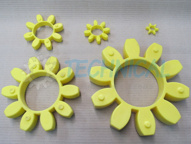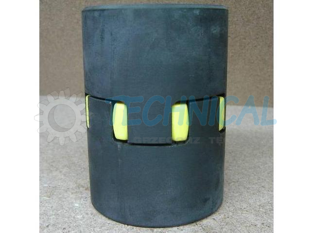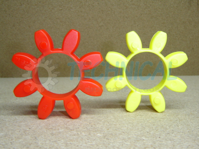 Łącznik elastyczny - element elastyczny sprzęgła - wkładka elastyczna sprzęgła w sprzęgłach kłowych TRASCO wykonany jest z poliuretanu. Ma kilka poziomów twardości i w zależności od potrzeb: żółty- 92º Sh (lepiej tłumi drgania niż czerwony), czerwony- 98º Sh (przenosi większy moment obrotowy niż żółty).