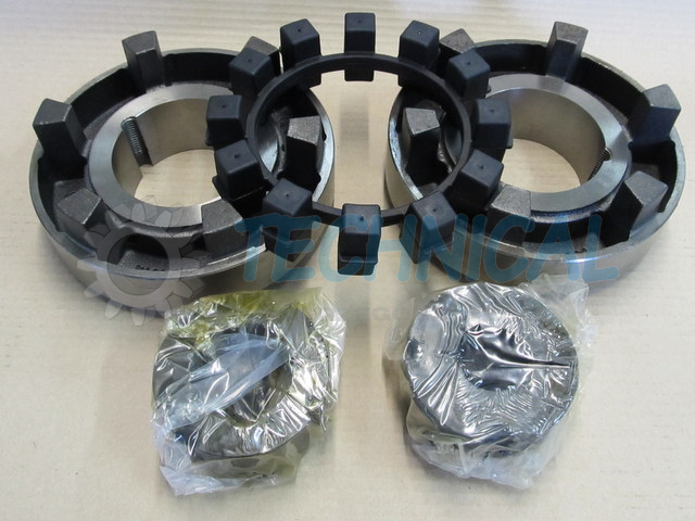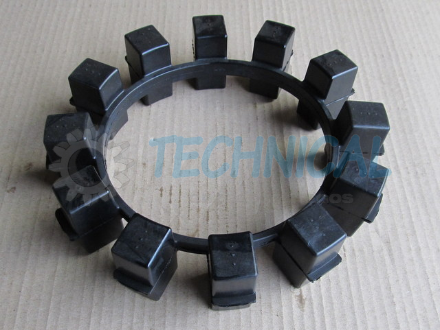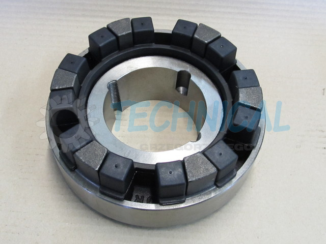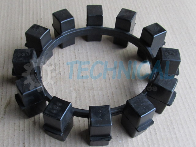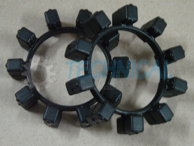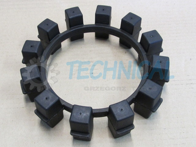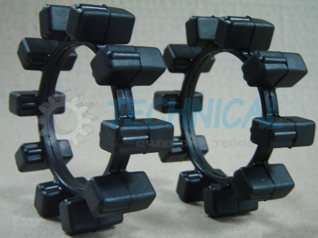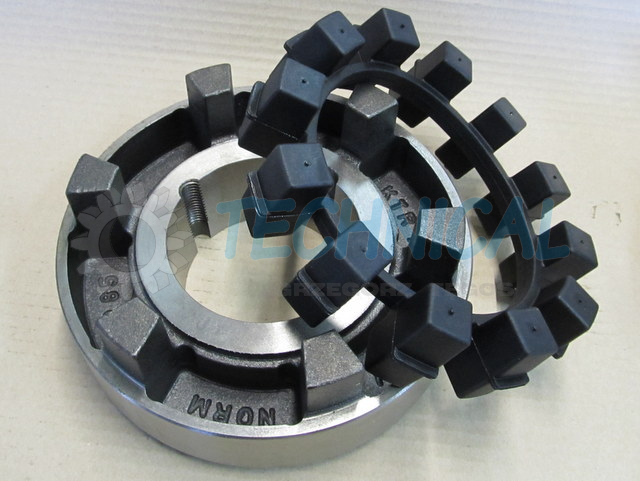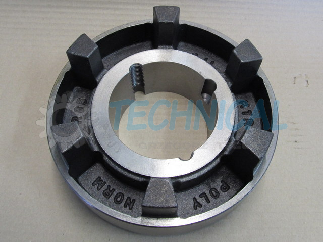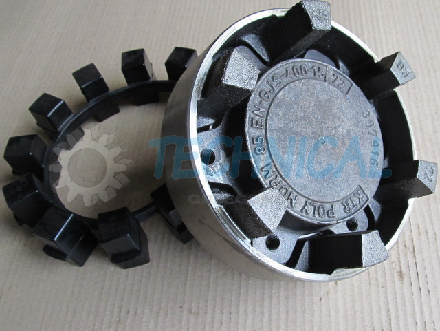 Sprzęgło Poly-Norm składa się z dwóch piast z kłami a pomiędzy nimi znajduje się łącznik elastyczny - pierścień elastomerowy - wkładka sprzęgła gumowa. Pierścień elastomerowy we wkładce z gumy jest zamknięty i zasprzęglony naprzemiennie pomiędzy kłami piast sprzęgła Poly Norm KTR. Piasty Polynorm zsuwa się osiowo z uwzględnieniem możliwości poprawnego zazębienia pomiędzy które umieszcza się elementy łączącego pierścienia elastomerowego - wkładke gumowa sprzęgła. Sprzęgło skrętne Poly Norm KTR przenosi moment obrotowy za pomocą ściśniętego pierścienia elastomerowego. Kompensowanie odchyłek połączonych wałów i wibracje są skutecznie pochłaniane przez sprzęgło Poly-Norm KTR. Sprzęgło PolyNorm to sprzęgło z wkładką gumową.