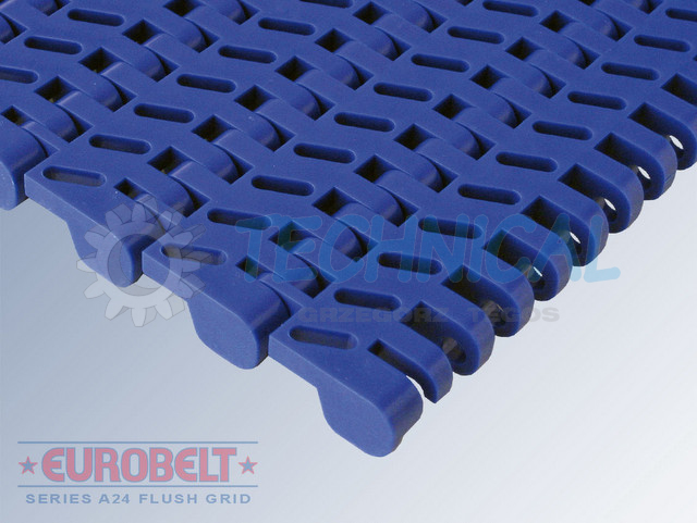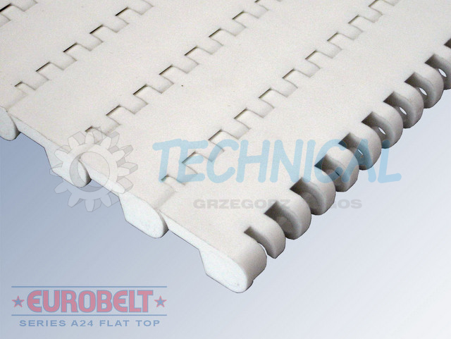 Taśma modularna Eurobelt A24 Flat Top jest taśmą całkowicie gładką z otwartymi krawędziami co stanowi o łatwości i szybkości mycia taśmy. Ich całkowicie otwarte krawędzie zwiększają efektywność czyszczenia i pozwalają nam na pracę w lepszych warunkach sanitarnych. Ta taśma modularna posiada w swej konstrukcji większe i bardziej otwartych połączeń zawiasowych co w czasie przewijania taśmy modularnej zapobiega kumulowaniu resztek.