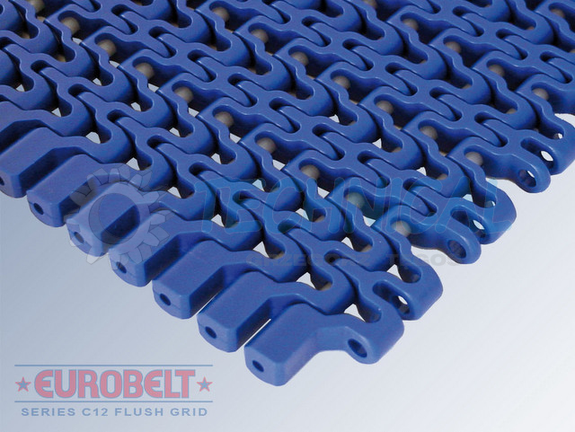 Taśmy modułowe C12 z powierzchnią Flush Grid jest idealna dla transportu produktów w przy użyciu dużych prędkości i małej średnicy obrotu. Konstrukcja z dostępnymi prętami oraz otwartą powierzchnią czyni ją bardzo łatwą do mycia i utrzymania czystości, gdzie: