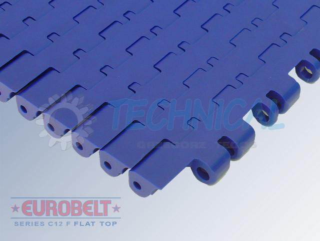 Eurobelt taśmy modularne C12 na przenośniki transportowe z podziałką 12mm umożliwiają transport małych produktów przy wysokich prędkościach liniowych, przy minimalnych średnicach rolek zwrotnych. Taśmy modularne C12 tej serii posiadają strukturę open-link z wzmocnieniami w kształcie widelca i umożliwiają przenoszenie dużych ładunków (nawet do 1950 kg/m szerokości taśmy).
