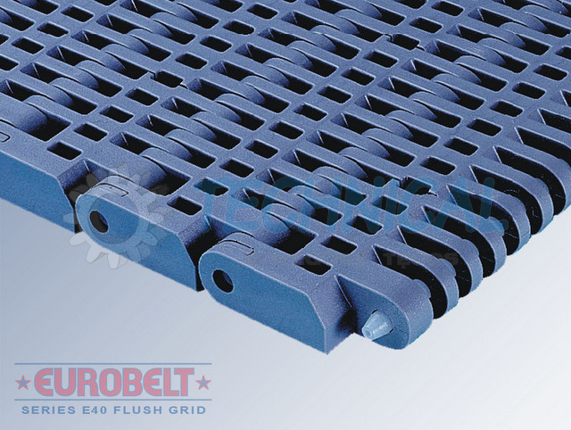 Taśmy transportowe modułowe z serii E40 o powierzchni Flush Grid ma powierzchnię kratownicy. Powierzchnia taśmy modułowej transportującej jest całkowicie gładka a 14% powierzchni taśmy modułowej stanowią otwory. Została ona zaprojektowana do przenoszenia produktów, które wymagają odprowadzenia cieczy. Idealnie sprawdza się w aplikacjach, gdzie wymagana jest duża wytrzymałość taśmy transportowej modułowej w bardzo długich transporterach taśmowych - przenośnikach z taśmą modułową lub przy bardzo ciężkich produktach.