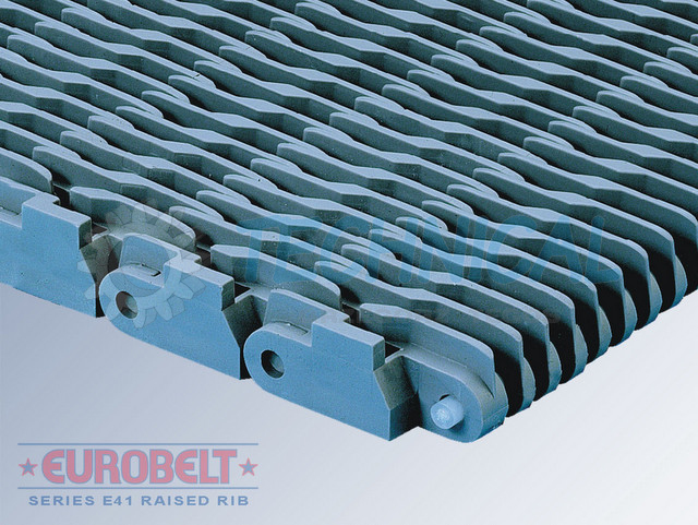 Seria Taśmy modułowej do pasteryzatorów E41 ma tą samą strukturę podstawową co seria E40, ale dodano do niej żebra na jej całej powierzchni. Wzmocnione centralnie żebra umożliwiają przenoszenie puszek, butelek szklanych, lub innych pojemników w poprzek taśmy bez ich przewracania lub uszkodzenia samej powierzchni taśmy.