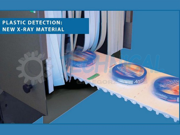 EUROBELT stworzył taśmy modularne przenośnikowe ze specjalnym tworzywem, o cząstkach 2 lub 3mm promienia kulistego, wstrzykiwanym w materiał, które może być wykryte przez detektory promieniowania X Ray,