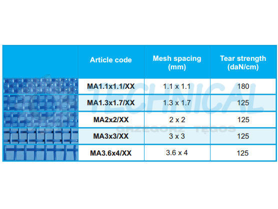 Pas siatkowy poliestrowy a średnica żyłek nośnych: od 0,9 do 1,2mmliczba żyłek na centymetr: 2- 5,2przepuszczalność powietrza: od 5000L/m²/s poniżej 200Pa, do 10000 L/m²/s poniżej 100Pa odporność na darcie: od 55 do 180 daN/cm minimalna średnica koła: 100mm (z wyłączeniem innych zamontowanych profili typu zabierak, fala boczna , kliny, palce)standardowa szerokość: do 1500mmwiększe szerokości dostępne na zapytanie posiadają certyfikaty FDA i EC w standardzie.